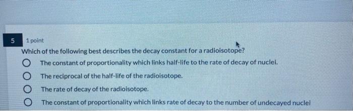 Expert answeredscijoe21Points 220 Log in for more information. C The constant of proportionality which links half-life to the rate of decay of nuclei. A sound wave e.